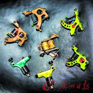 几把文身枪、一套颜料、一支描边笔,基本上构成了一个文身师日常工作的全部。不同文身枪的价格差异也非常大。刘健向记者展示了一支意大利产的文身枪,价值4000元。“好的文身师有十多把文身枪很正常,他们往往在构图的时候已把要有的文身枪想好了。”