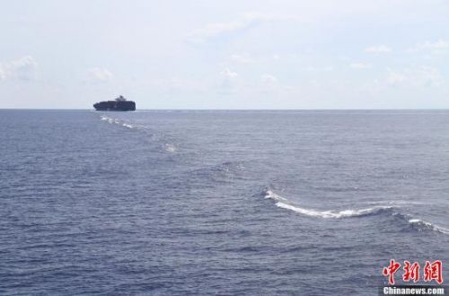 经过连续90多小时破浪前行,海南赴南沙捕捞船队于10日上午10时许穿过北纬12度线,进入南沙海区航行。南沙群岛扼控太平洋与印度洋的海上交通线,记者上午不时看到有大型集装箱船从船队不远处驶过。图为一艘大型集装箱船朝东北方向驶去。轮船驶过带起的海浪延绵数公里。王子谦 摄