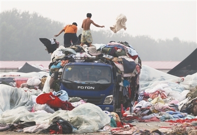 房山窦店镇的废旧衣服集散地,工人们从车上卸下大量废旧衣服和被褥。