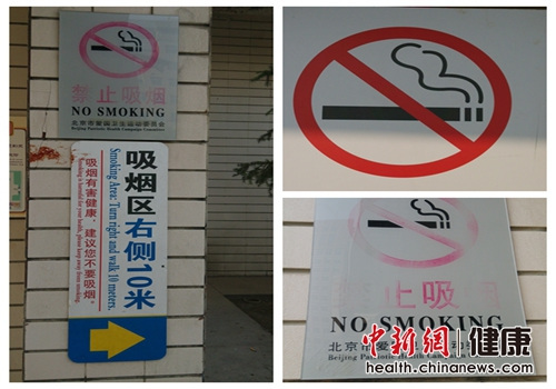 此外,医院禁烟也是本次审议的议点之一。中新网健康频道走访了北京地区部分医院,发现目前多数大型医院都在门口设置了明显的“无烟医院”及“禁止吸烟”的标志,如北京朝阳医院、北京大学人民医院、广安门医院、空军总医院、北京儿童医院等。在医院门诊大厅、病房及诊室走廊等区域,均有明显禁烟标志和“吸烟有害健康”的提示。