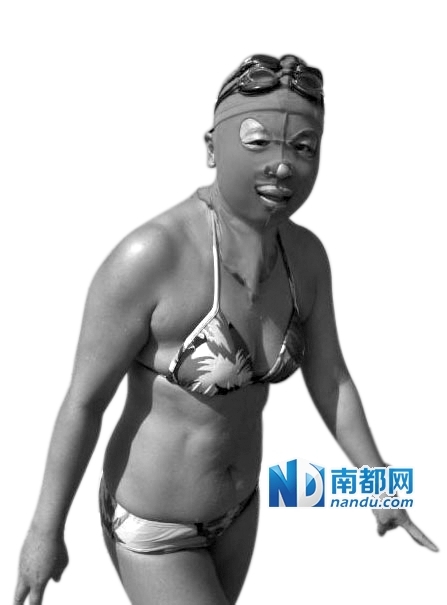 几乎在登上国外时尚杂志的同时,有人拍到了“脸基尼”大妈重出江湖的照片,8月8日,在青岛第一海水浴场的“全民健身日”主题活动启动仪式现场。不过,据说奇葩的造型当场就吓哭了小孩。