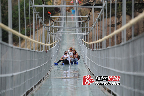 (游客玻璃桥上拍照。)