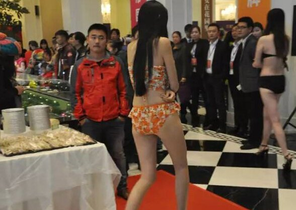 2015年10月,河南驻马店市某国际广场盛大开盘,请来数十位中外比基尼美女为“准业主”提供星级服务。现场多名中外美女端着果盘饮料穿梭在人群中。