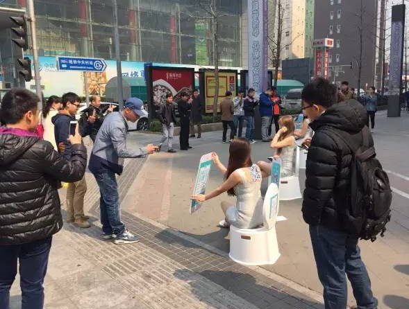 2015年3月,北京中关村、望京等IT人士集中的地方,一群着装清凉的长腿美女手拿模型手机,带着马桶出现,引导路人扫描她们手中和身上的二维码。据悉,这群美女是为某招聘平台的活动做推广。