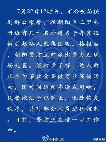 7月22日,还是北京,还是国贸,几十名露两点的外国男子走上街头,立即引起围观。被称为“三里屯斯巴达勇士”。后来得知,这也是北京某甜品店的街头“肉推”活动。当时的画风是这样的: