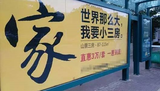 2015年6月,四川德阳一房产公司在市内公交车站打出广告,广告语是“世界那么大,我要小三房”。有市民反映,这个广告连学校对面的公交车站也没放过。