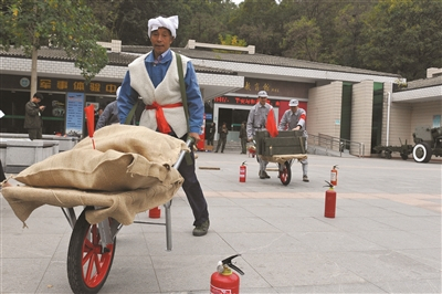 国防园添新花样 推独轮车“送军粮”