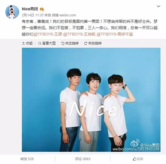 @Nice男团:有志者,事竟成!我们的目标是国内第一男团!不想当将军的兵不是好士兵。梦想一定要宏远。我们不怕苦,不怕累,三人一条心。我们相信,总有一天可以超越你们@TFBOYS-王源 @TFBOYS-王俊凯 @TFBOYS-易烊千玺