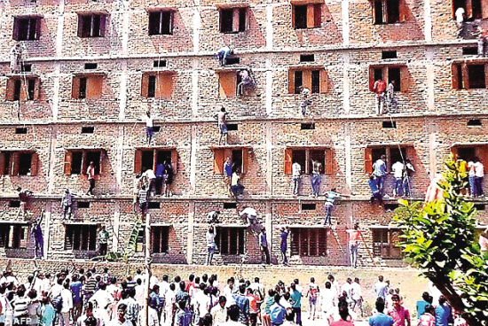 ■去年,比哈尔邦一中学学生家长爬墙给子女递纸条。