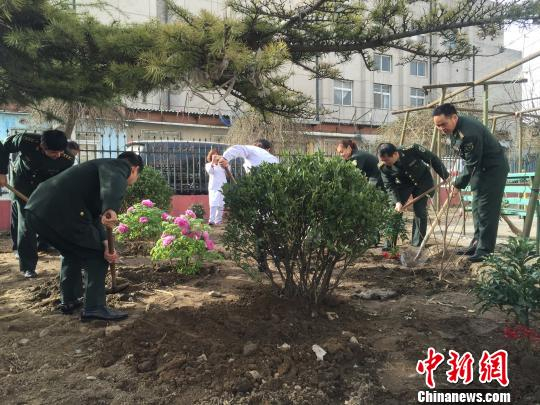 军事医学科学院团委领导帮助北京丰台鹤童老人院开展营区绿化工作。 沈基飞 摄