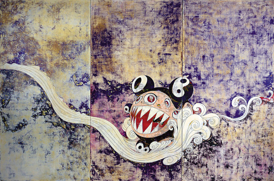 此画的三联构图让人将其与日本传统折叠屏风的形制进行对比,同时也突出了图像的平面特性。村上隆有时候采用单色背景呈现出一个非常平滑的图像表面,但这里画布表面的参差斑驳状态显示出绘画时多层涂刷的痕迹。村上隆在涂用色料后,即刻刮擦分散颜料,因此营造出这种类似于19世纪晚期日本画的效果。