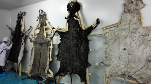 整张的驴皮钉在木制架子上