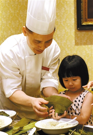深圳富苑皇冠假日酒店富临门中餐厅推出四款经典口味的香粽,有瑶柱裹蒸粽、健康八宝粽、咸蛋鲜肉粽、红豆沙枧水粽以及什锦香粽礼篮可供选择。上周六,酒店邀请了六位微信粉丝参加黎师傅的厨艺课堂。学员们在黎师傅的现场指导下对手工包粽子有了进一步的了解,最后展示了自己的课堂成果。