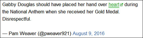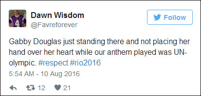 在国歌响起的时候,道格拉斯应该把手放在胸口,然而她并没有。这是极大的不敬。