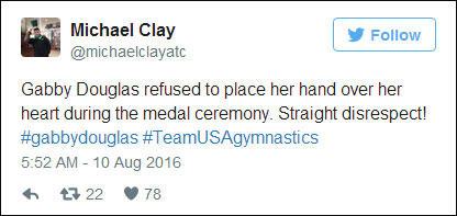 但是,美国队选手之一加布丽埃勒·道格拉斯(Gabby Douglas)还来不及享受胜利的喜悦,就被美国社交网络的一片讨伐之声淹没了。
