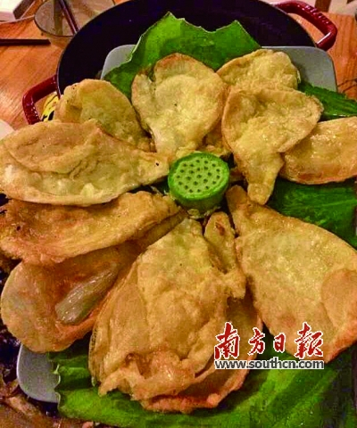 一盘用面粉鸡蛋液裹着炸好的莲花,以碧绿的荷叶衬托着,中间摆着莲蓬,莲花般盛放在眼前,甚至还能感受她风中摇曳的清艳倩影。我当时那种吃惊的程度,不亚于外国人看到中国人吃狗,外省人看到广东人吃蛇吃老鼠的惊诧:这也能吃,这也忍心吃?