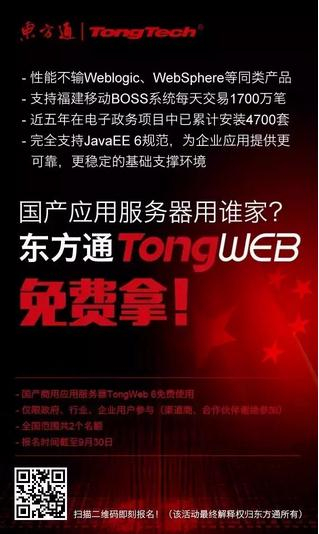 恰逢建国67周年华诞,9月20日,东方通正式启动“国产服务器用谁家?东方通TongWeb免费拿”活动。此活动是面向全国政府、行业、企业用户,免费提供东方通企业级商用应用服务器产品TongWeb6,通过试用与比较,进而替换国外品牌同类中间件产品的活动。