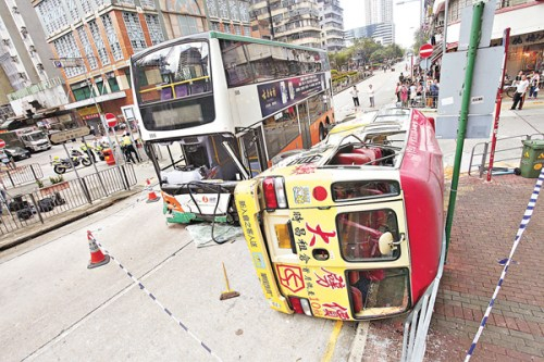 肇事双层新巴拦腰把小巴撞翻,导致15人受伤。