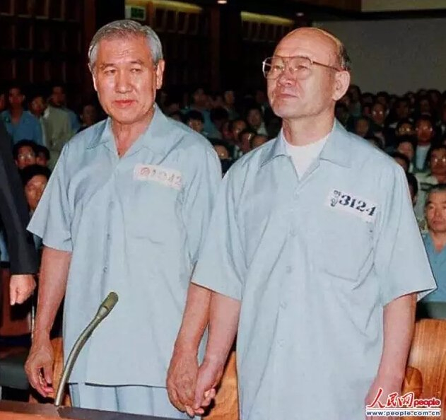 当地时间1996年8月26日,韩国前总统全斗焕(右)和卢泰愚(左)同时出庭受审。