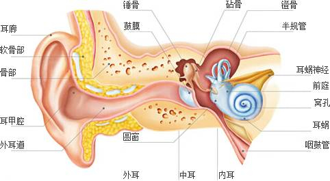 耳朵的结构分为三部分:外耳、中耳、内耳。