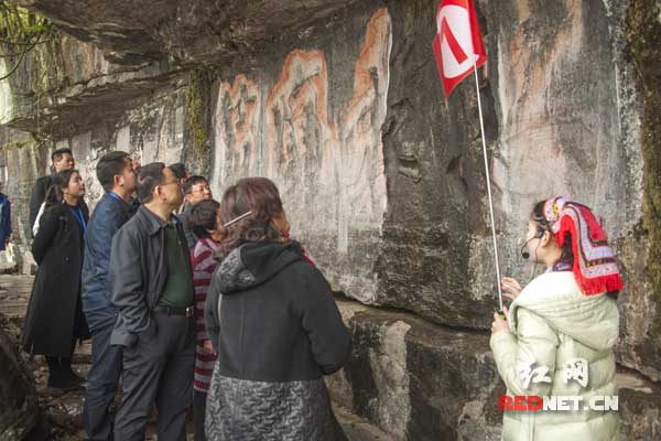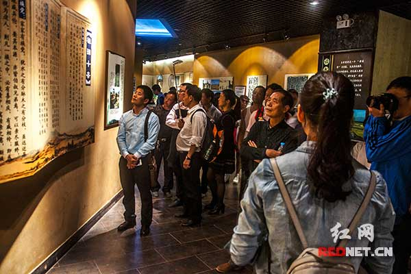 游客在该村月陂亭景点观赏湖南省最早的文天祥“忠、孝、廉、节”临刻碑。
