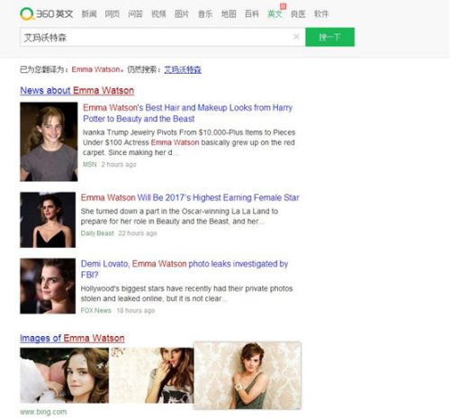 例如,通过360英文搜索艾玛沃特森的相关英文资讯,360英文可以搜索通过中文、拼音智能识别技术搜索英文“Emma Watson”,为用户直接提供Emma Watson的第一手英文咨询。