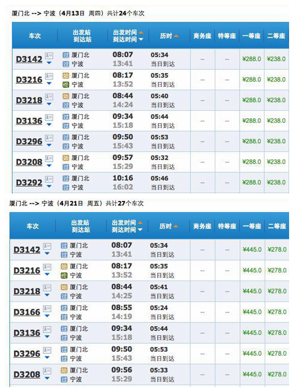 厦门北到宁波的26个动车组车次中,对比4月13日与21日的票价,一等座全部涨价,由目前的统一票价288元调整到353元至445元区间票价,涨幅最高达58%;二等座中,只有D3212一个车次降价,由238元降到221元,降幅7%,其余车次由238元调整到265元至278元区间票价,涨幅最高达16.8%。