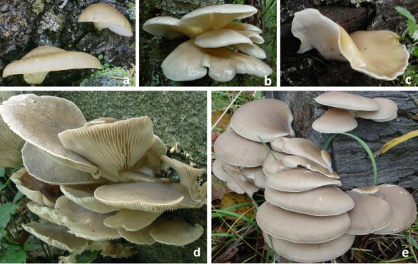 中国平菇常见物种:a. 冷杉侧耳Pleurotus abieticola; b. 肺形侧耳P. pulmonarius; c. 卵孢侧耳P. placentodes;?d.(糙皮侧耳)P.?ostreatus; e. 佛罗里达侧耳近似种P. cf. floridanus?