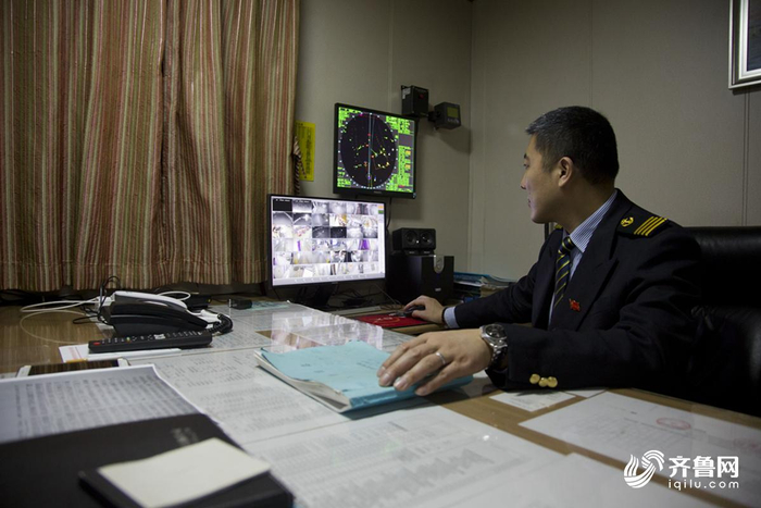 当船舶进港或离港时,是林旭强最忙的时候。即使是顺利的离港,林旭强也不敢怠慢,他不仅要随时关注着船舶的航行路线,确保航行安全,还要随时通过监控观测船上的动态。图为“渤海玛珠”号客滚船顺利离港后,林旭强在办公室里继续值班,随时关注着船舶的航行路线及船上的动态。齐鲁网记者 孙长征 张伟 摄