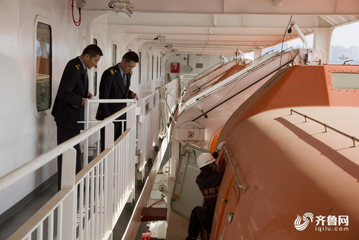 抵达大连港后,林旭强来不及休息,继续对船舶进行巡查。图为林旭强和政委一起巡查救生艇。齐鲁网记者 孙长征 张伟 摄