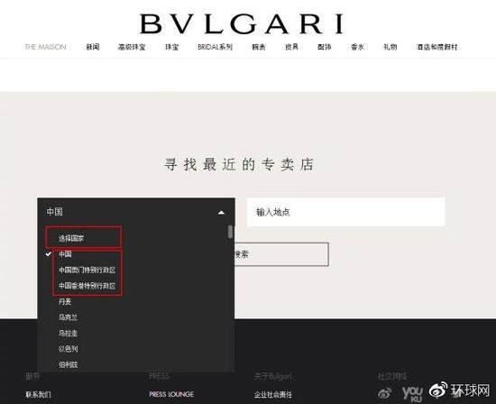 在“寻找最近的专卖店”时选择“国家”,标注了“中国澳门特别行政区”“中国香港特别行政区”,但“台湾”还是与“中国”并列。