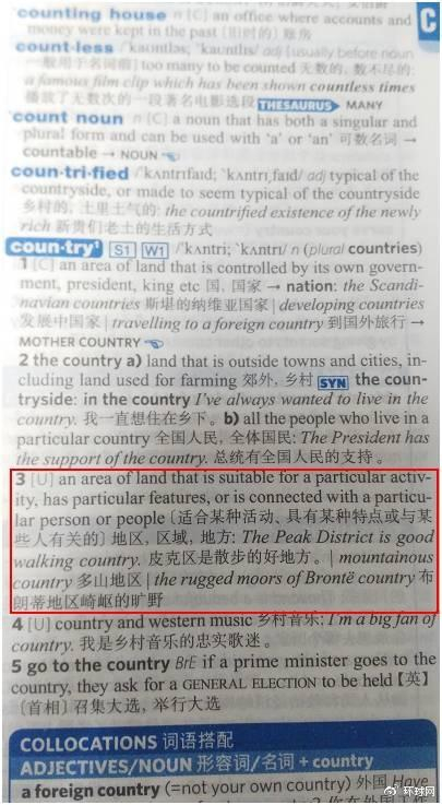 Country常用的意思就是国家、农村、地区这三个,用作地区的时候是说这个地区有某种特色,不可数,前面都有个描述特色的词来修饰限定。