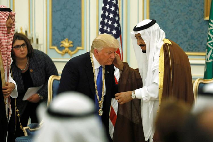 在沙特王宫举行的盛大欢迎仪式上,特朗普被授予阿卜杜拉·阿齐兹勋章,这是沙特向本国公民和外国友人颁发的最高级别勋章。不过,特朗普当天接受沙特国王萨勒曼颁赠勋章时,身高188厘米的特朗普“屈膝、俯身、低头”让萨勒曼替他挂上勋章的一系列动作,引起了世界媒体及网友的热议。