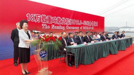 6月22日上午,裘援平主任出席了美国福茂集团在青岛北船重工建造的18万吨散货船63号船接船仪式,并应邀担任命名人,命名该船为“欧梅”号轮。