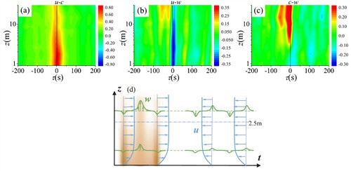 带通滤波(0.001Hz~0.03Hz)后的流向速度脉动u与PM10浓度脉动c的相关系数(a)、u与垂向脉动速度w的相关系数(b)和c与w的相关系数(c)。(d)为高速和低速超大尺度结构时间演化概念图,棕色阴影代表PM10浓度。