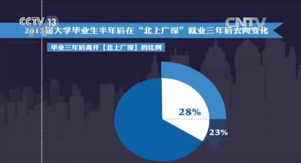 我们接着来看一组数据。根据对2013届大学毕业生三年的跟踪调查,2013届本科生毕业半年后在“北上广深”就业的比例为28%,三年后对该群体的再次跟踪评价发现,2013届毕业半年后就业于北上广深的大学生中,毕业三年后仍在“北上广深”的本科生比例为77%,也就是说,当年选择留在北上广深的本科生里,有23%的人“逃离”了北上广深。