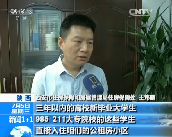 西安市住房保障和房屋管理局住房保障处处长 王炜鹏:三年以内的高校新毕业大学生以及五年之内的新毕业的985、211大专院校的这些学生可以免于资格审核直接入住咱们的公租房小区。