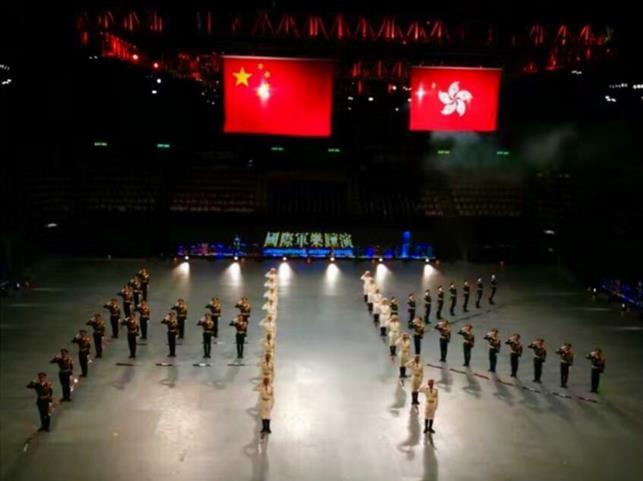 容纳上万名观众的香港红磡体育馆座无虚席。香港特别行政区、中联办、外交公署及解放军驻香港部队的有关领导与观众一同观赏这场军乐盛宴。