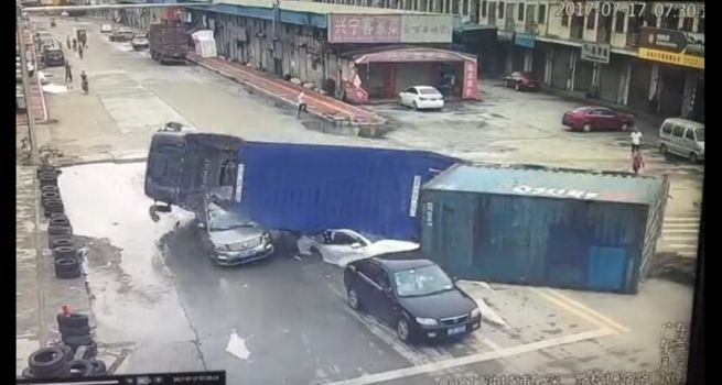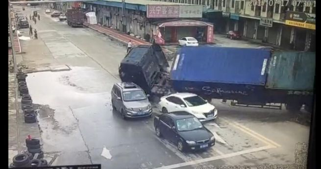 7月17日上午,在东莞市凤岗镇S255省道油甘埔红绿灯路段发生一宗货柜车失控侧翻相继与4辆小汽车碰撞、碾压的交通事故,造成4人受轻微伤(无生命危险)及车辆损坏。