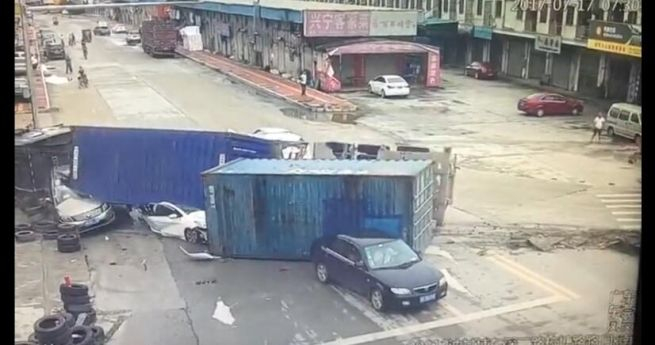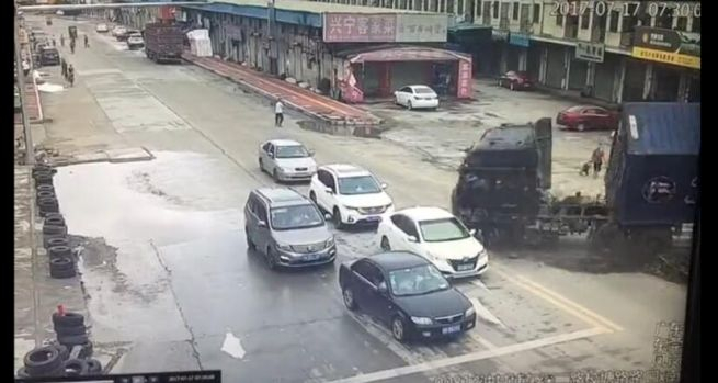 小车被大货柜车碾压