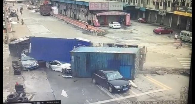 从网友拍摄的视频中可以看到,一辆大货柜车侧翻在路旁,车厢的后半截已经完全翻到在地,有2部小车被碾压,其中白色小车几乎被完全碾压。