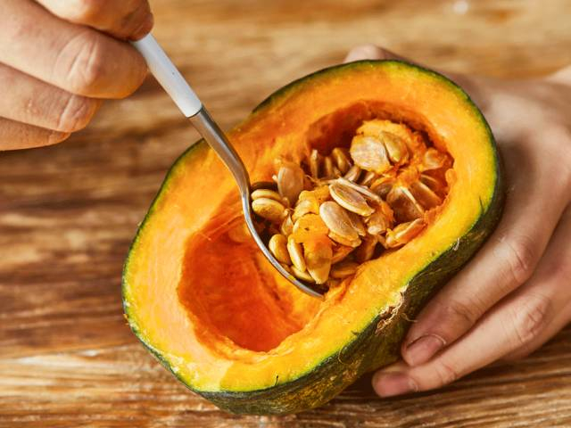 贝贝南瓜的瓜籽也很好去除,对半切,用勺子一挖 ,就只剩瓜肉啦!