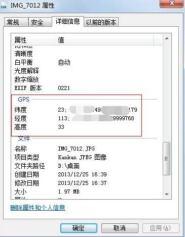 ?GPS经纬度信息都列出来了有没有!这是因为拍照的时候没有关闭手机的定位服务功能,所以拍出来的照片是带有GPS信息的。而关闭定位服务功能后拍的照片是没有此项信息的。