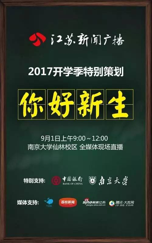 互动话题:“我对新生说”,说出你的大学故事,分享你的大学趣事,发送“你好新生+留言”即可,只要您的留言在直播节目中播出,就将获得一份江苏新闻广播送出的礼品。