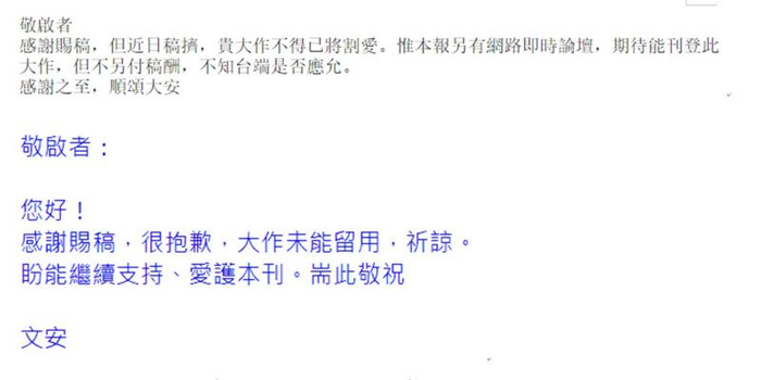 此外,在台期间与我信件来往较多的当属报社编辑,而就算是一封婉拒稿件的邮件,也写得让你没脾气,像是如下两封,感受一下。
