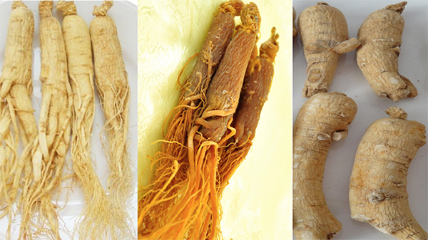 生晒参(左图)、红参(中图)和西洋参(右图)