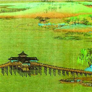 在中国十大传世名画中,有两幅诞生于宋徽宗时期,一幅为世俗繁华的史诗——《清明上河图》,另一幅为锦绣河山的颂唱——《千里江山图》。作为北宋时期的一幅青绿山水孤品,《千里江山图》全幅构图景象开阔,取用传统的散点透视法,以略带俯视的角度横向展开了全景式大山大水,气势宏大。
