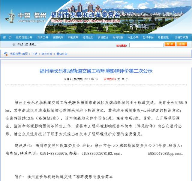 昨日,福州市发改委在其官方网站对福州至长乐机场轨道交通工程环境影响评价进行了第二次公示。