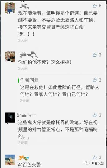 有网友评论:“现在能活着,证明你是个奇迹!自己耍酷不要紧,不要危及无辜路人和车辆,接下来坐等交警哥严惩这些亡命之徒!”。