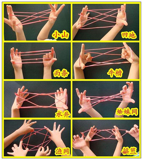 翻花绳在中国不同的地域,有不同的称法,如线翻花、翻花鼓、挑绷绷等。这是一种翻绳游戏的活动,主要是依靠手指来操作。每一个造型图案,需要手指完成撑、压、挑、翻、勾、放等一些精微的动作,需要左右手配合一致,需要每根手指巧妙地分工。在这一过程中,需要开动脑筋。